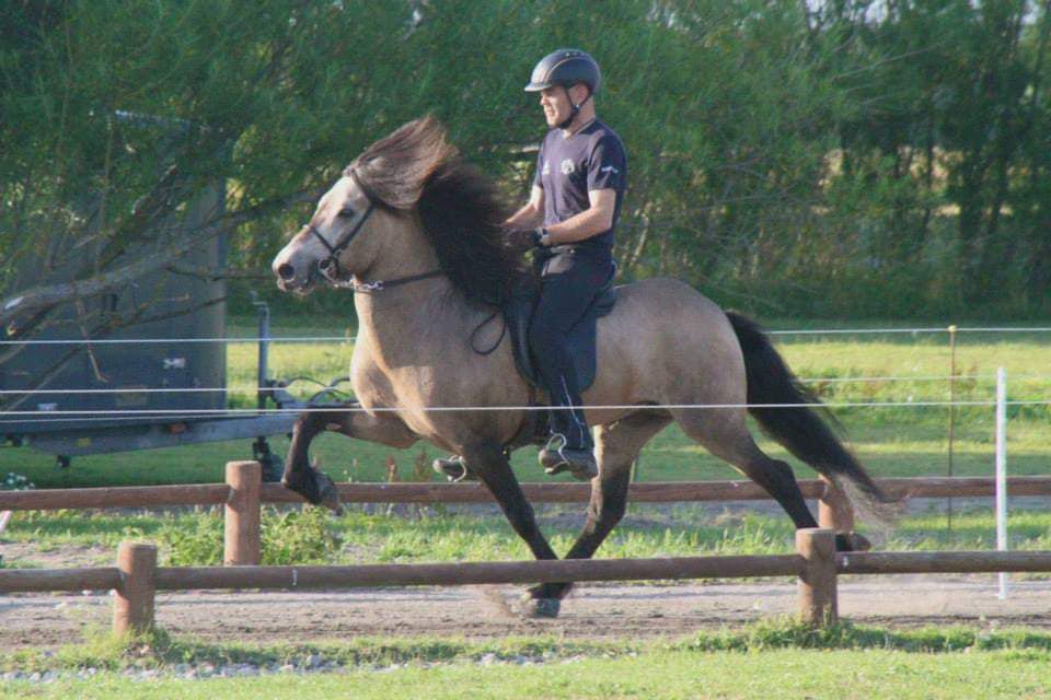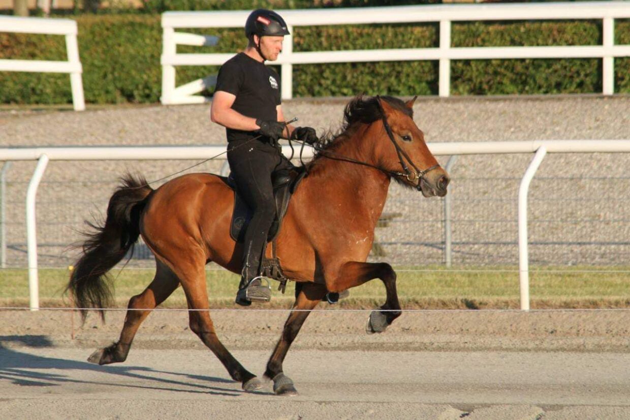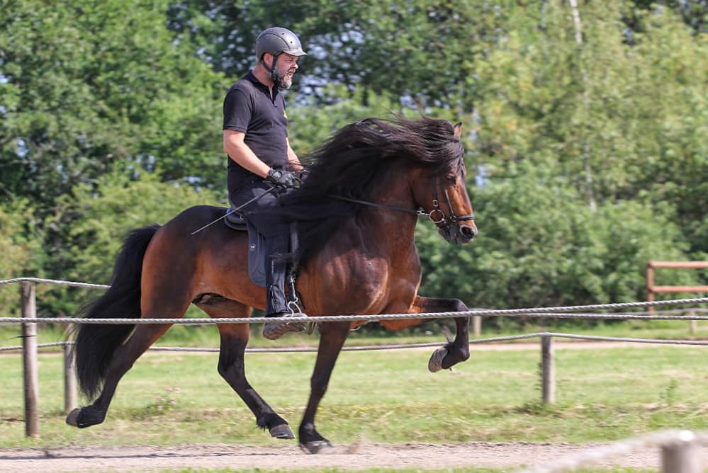 Halfdan fra Enholm, født i 2006 efter Glitnir frá Strandarhöfði. Kåret første gang som 5-års i 2011 med 8.04 total som 4-gænger med 9 for både tölt og galop. Kåret igen i 2012, hvor han opnåede en kåring på 8.19 i BYG, 8.25 i RID og en total på 8.22 som 4-gænger. Herunder fik han 8.5 for proportioner, benkvalitet, trav, form u. rytter, langsom tölt, arbejdsgalop og 9 for RygKryds, galop, vilje og sind samt 9.5 for tölt. Han har ind til videre fået 44 afkom, hvoraf de tre er kårede. Højest kårede afkom er hingsten Mestur fra Qvistorf efter Míra frá Langholtsparti, kåret som 6-års i 2019 med 8.46 i BYG, 7.85 i RID og en total på 8.10 som 4-gænger. Foto: Dea Vemming