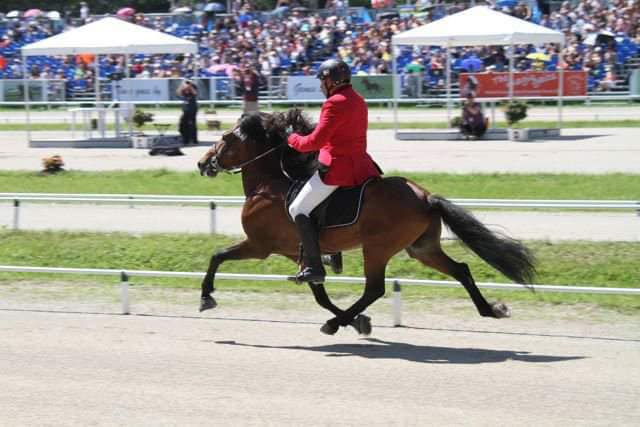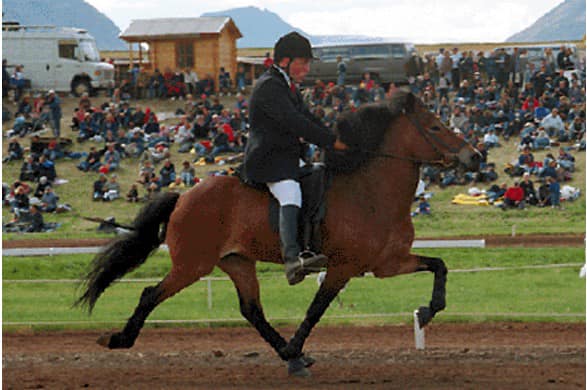 Hátíð frá Garði blev avlet af Sigurjón Björnsson. Hun blev kåret på Island første gang som 6-års i 1997 og igen i 1998, hvor hun opnåede en kåring på 7.78 i BYG, 8.33 i RID og 8.05 total. Hun fik 8.5 for RygKryds, galop, vilje og form u. rytter samt 9 for tölt. Hendes højeste karakter for pas er 8. Foto: Eiríkur Jónsson
