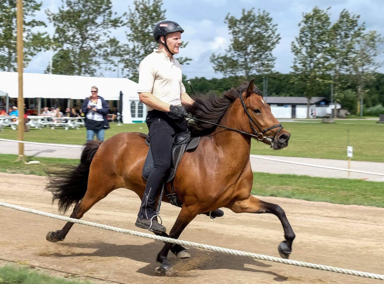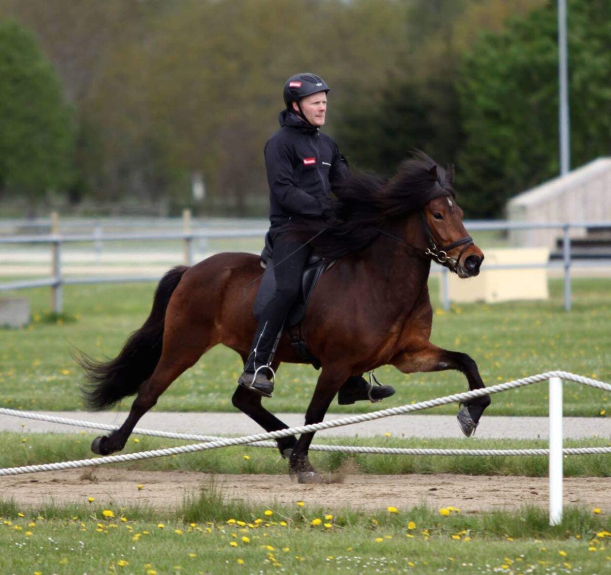 Kvasir fra Lille Ensted, født i 2004 efter Fáni frá Hafsteinsstöðum. Kvasir er eneste afkom efter Hátíð, der ikke er kåret. Han har gået sport. På billedet er han redet af Camilla Gudmandsen. Foto: Vanessa Dreisig