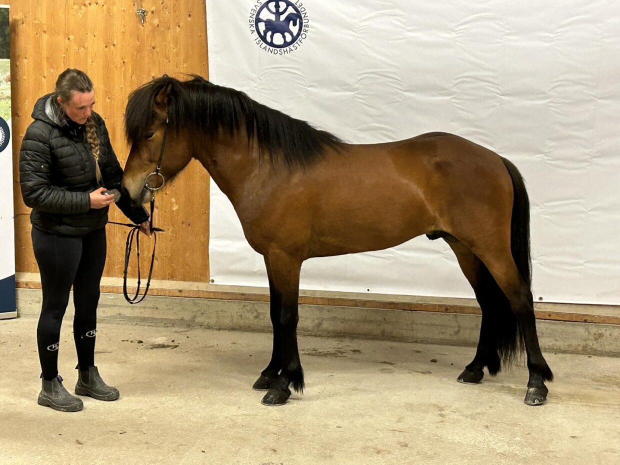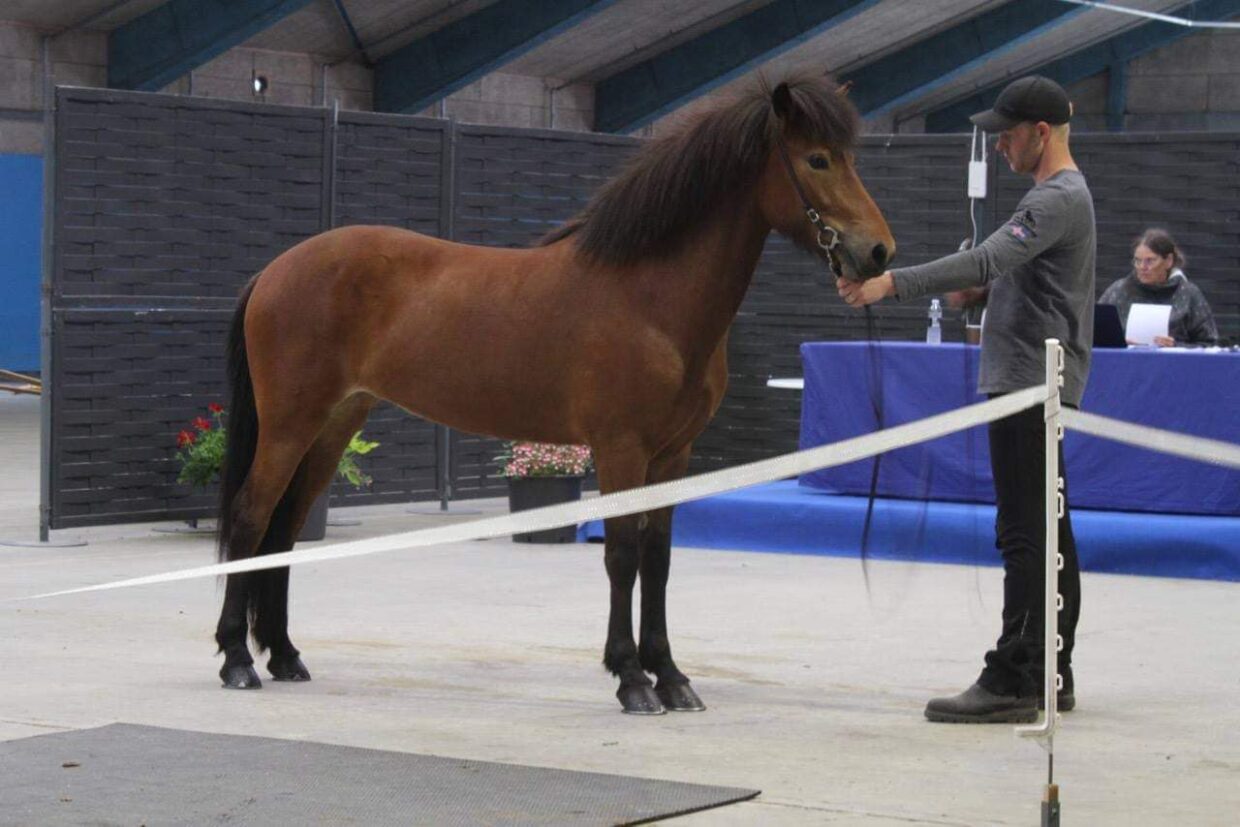 Ágústa fra Lille Ensted, født i 1999 efter Otur frá Sauðárkróki. Kåret i 2009 10 år gammel med 7.70 i BYG, 7.73 i RID og en total på 7.72 som 4-gænger. Herunder 8.5 for tölt, trav og arbejdsgalop. Hun fik 12 afkom, hvor ind til videre ét er kåret (Gletting fra Lille Ensted med 7.61 total), inden hun døde i 2021. Rytteren på billedet er Cecilie Flydahl, der kårede hende. Foto: Dea Vemming