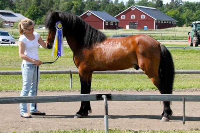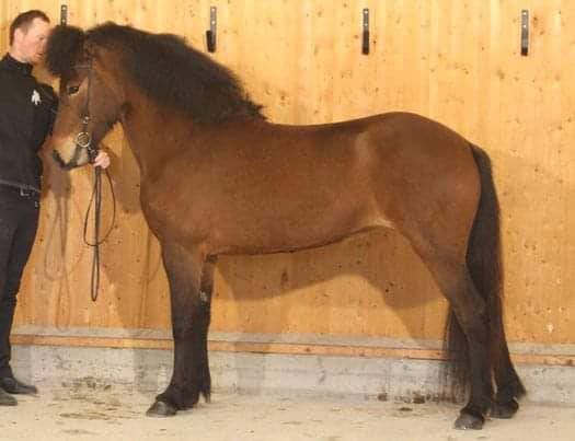 Stjarna fra Lille Ensted, født i 2002 efter Dagur frá Kjarnholtum I. Kåret i 2009 7 år gammel med 7.68 i BYG, 7.76 i RID og en total på 7.73 herunder 8.5 for galop, ville og sind. Stjarna fik to hoppeafkom, begge efter Óskar fra Guldbæk (FM Són frá Hólum), kåret med hhv. 7.18 og 7.64 i total. Foto: Lille Ensted