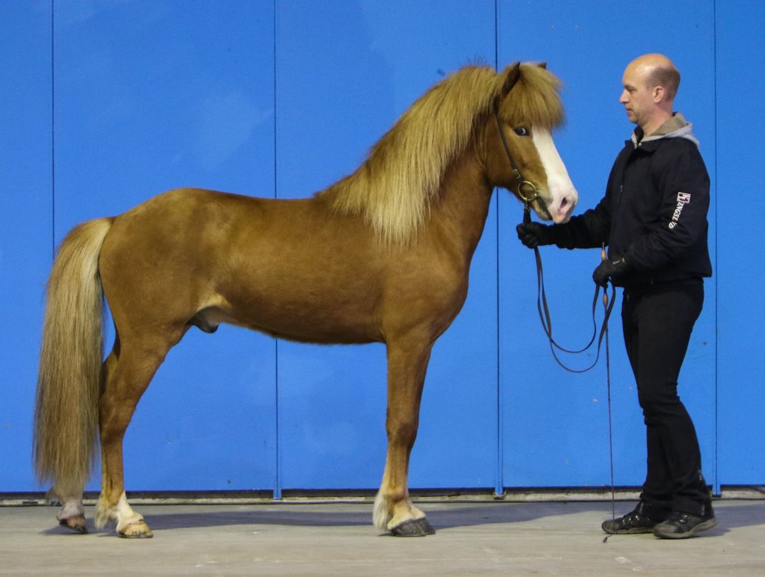 Hósías fra Engholm, født i 2007 efter Sleipnir fra Moselundgård. Kåret første gang i 2013 som 6-års med 7.97 som 4-gænger. Kåret igen i 2015 hvor han opnåede en kåring på 8.34 i BYG, 8.08 i RID og en total på 8.19 som 4-gænger herunder med 8.5 for proportioner, hove, hårpragt, trav, galop og form u. rytter samt 9 for benkvalitet, tölt, vilje og sind. Han har ind til videre 58 afkom, hvoraf de to er kårede. Højest kårede er den svenskfødte, pseudoalbino Limbó från Änghaga med 8.10 total og op til 9 for RygKryds og langsom tölt. Foto: Dea Vemming