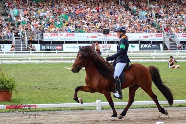 Liður fra Slippen, født i 2009 efter Garri frá Reykjavík. Avlet af Jóhann Rúnar Skúlason. Han blev kåret første gang som 4-års i 2013 med 8.04 i BYG, 8.40 i RID og en total på 8.25 herunder 8.5 for rygKryds, tölt, galop, form u. rytter samt 9 for hove, vilje og sind. Hans højeste kåring er som 7-års i 2016, hvor han opnåede en kåring på 8.09 i BYG, 8.53 i RID og en total på 8.36. Han har fået 18 afkom, hvoraf de fire er kårede. Han blev solgt til Holland, hvor han går sport med Manon de Munck. På billedet er de til VM i Berlin 2019, hvor de fik bronze i F1 Young Riders. Foto: Michelle Fotografie