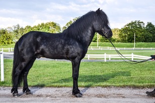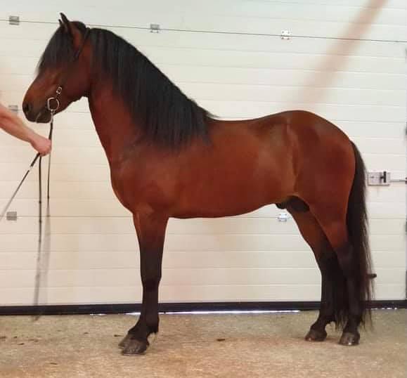 Sóley-sønnen Mídas fra Jelshøjen, født i 2012 efter Sæfari frá Hákoti. Mídas er kåret som 7-års med en total på 8.50 herunder 9 for rygKryds, proportioner, hårpragt og pas. Han har ind til videre fået 41 afkom, og gik sport et år med Steffi Svendsen, inden han blev solgt til Østrig. Foto: Matilde Bøgh